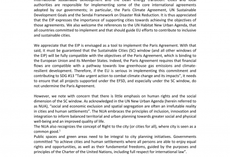 We appreciate that the EIP is envisaged as a tool to implement the Paris Agreement. With that said, it must be guaranteed that the Sustainable Cities (SC) window (and all other windows of the EIP) will be fully compatible with the objectives of the Paris Agreement, which is binding to the European Union and its Member States. Indeed, the Paris Agreement requires that financial flows are compatible with a pathway towards low greenhouse gas emissions and climate-resilient development. Therefore, if the EU is serious in implementing this commitment and contributing to SDG #13 "Take urgent action to combat climate change and its impacts", it needs to ensure that all projects supported under the EFSD, and especially under the SC window, do not undermine the Paris Agreement.